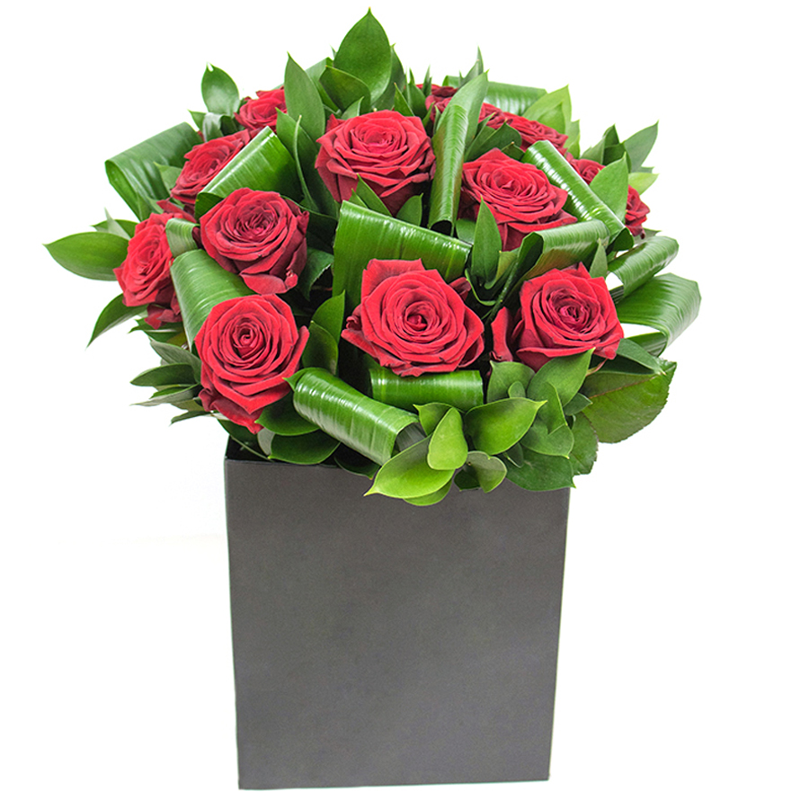 Immerse yourself in the splendor of our stunning bouquet, masterfully crafted with vibrant red roses, elegant aspidistra leaves, and graceful ruscus. Each flower is hand-selected to guarantee exceptional freshness and quality, adding a touch of sophistication to any space.