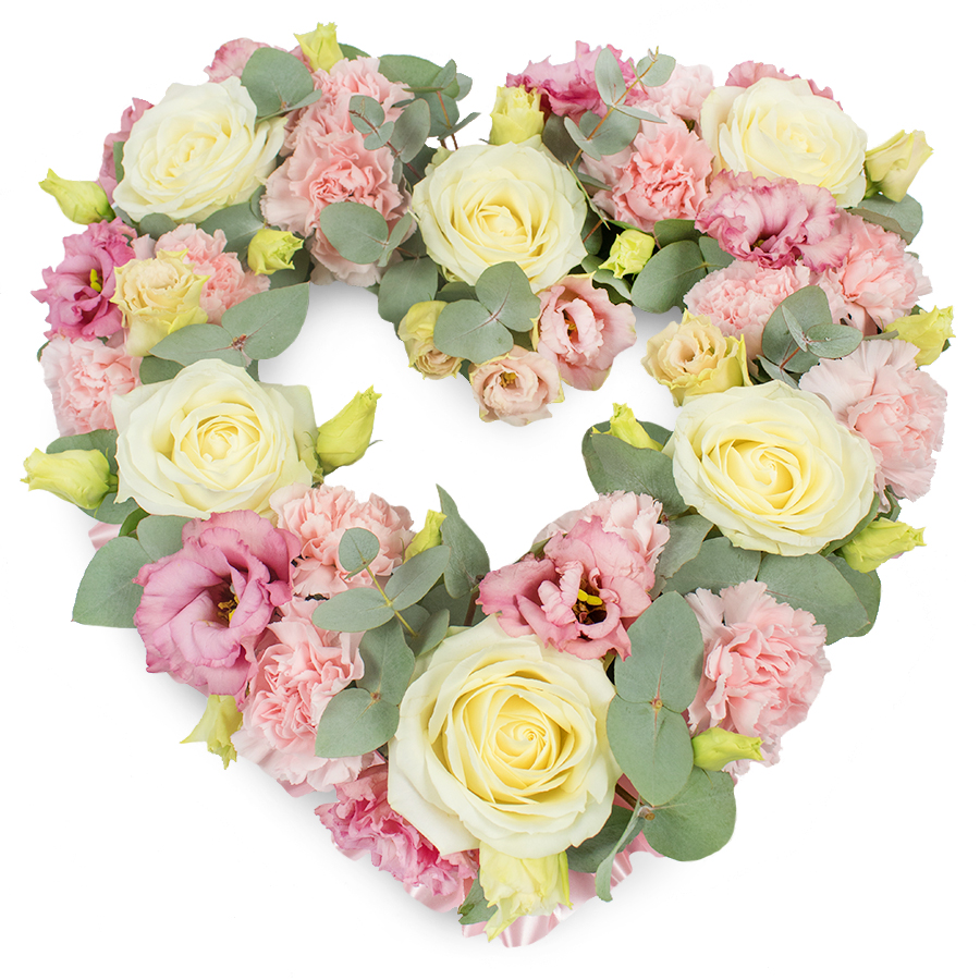 Express your sincere condolences with this lovely heart-shaped bouquet. Featuring elegant white roses, delicate pink carnations, beautiful pink lisianthus, and fragrant eucalyptus leaves, this arrangement is a perfect symbol of love and remembrance.